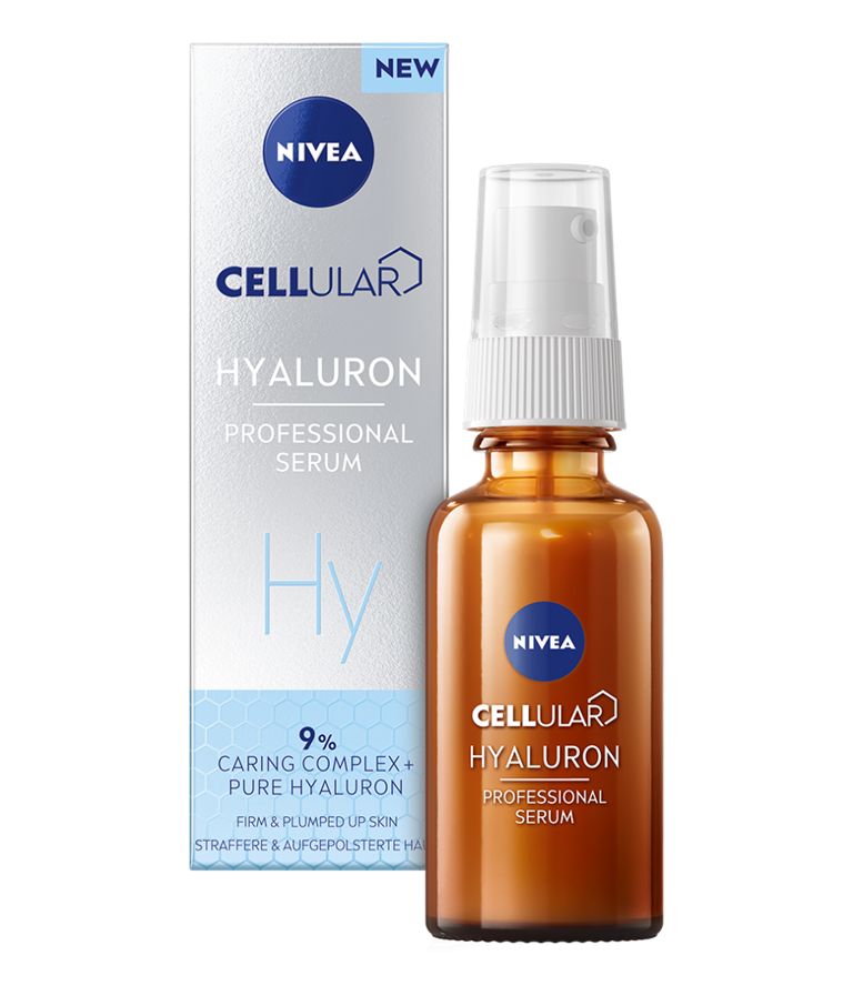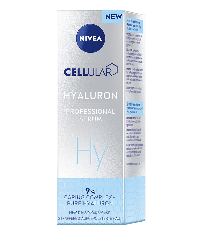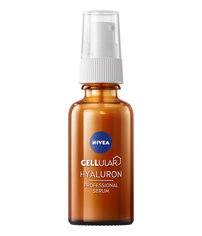 NIVEA® CELLULAR HYALURON profesionalus serumas su gryna hialurono rūgštimi ir 9% „Caring Complex“ kompleksu.