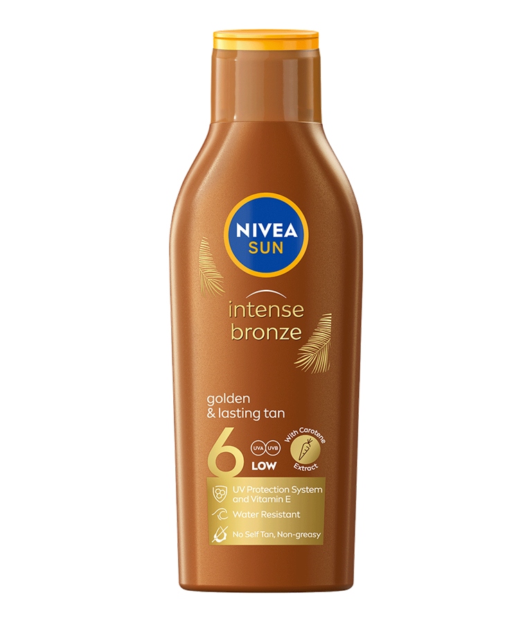 NIVEA SUN Intense Bronze losjonas nuo saulės su SPF6 suteikia apsaugą nuo UVA/UVB ir padeda odai greitai įgauti gražų auksinį įdegį, prailgina įdegį ir suteikia gražaus švytėjimo.