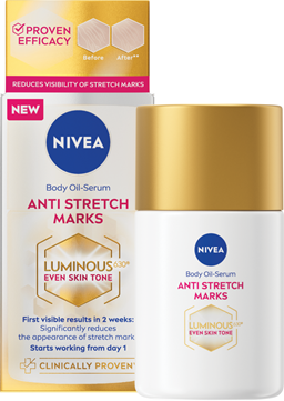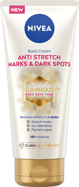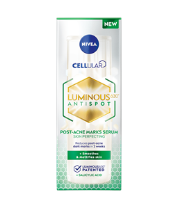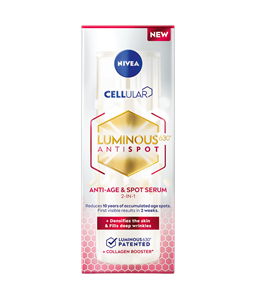 Aqua, C12-15 Alkyl Benzoate, Glycerin, Alcohol Denat., Butyl Methoxydibenzoylmethane, Ethylhexyl Salicylate, Cetearyl Alcohol, Dibutyl Adipate, Distarch Phosphate, Glyceryl Stearate, Bis-Ethylhexyloxyphenol Methoxyphenyl Triazine, Isobutylamido Thiazolyl Resorcinol, Sodium Hyaluronate, Tocopheryl Acetate, Ethylhexylglycerin, Diethylamino Hydroxybenzoyl Hexyl Benzoate, Phenylbenzimidazole Sulfonic Acid, Sodium Stearoyl Glutamate, Xanthan Gum, Cellulose Acetate, Magnesium Stearate, Sodium Chloride, Trisodium EDTA, Sodium Hydroxide, Phenoxyethanol, Parfum, CI 77491, CI 77499NIVEA CELLULAR LUMINOUS 630® ANTISPOT PAŽANGAUS POVEIKIO SERUMAS NUO PIGMENTINIŲ DĖMIŲ. Sumažina trijų tipų pigmentines dėmes: 1. Ssaulės sukeltas pigmentines dėmes. 2. Nėštumo ir menopauzės sukeltas dėmes. 3. Senatvines pigmentines dėmes. Inovatyvi sudėtis, papildyta LUMINOUS630® ingredientu, kuris veikia ląstelių lygmenyje ir kovoja su pigmentinėmis dėmėmis: 1. Veikia esamas pigmentines dėmes: - po 2 savaičių: pigmentinės dėmės akivaizdžiai pašviesėja; - po 8 savaičių: sumažėja pigmentinių dėmių intensyvumas ir dydis. 2. Apsaugo nuo naujų pigmentinių dėmių atsiradimo. 3. Naudojant reguliariai*, oda tampa lygi ir švytinti. *Remiantis 12 savaičių tyrimu. Optimaliems rezultatams pasiekti naudokite su kitomis priemonėmis iš LUMINOUS priemonių linijos nuo pigmentinių dėmių.