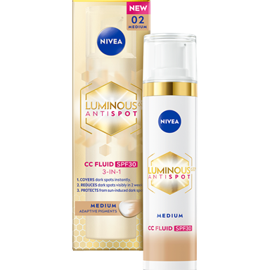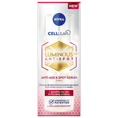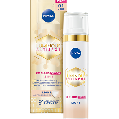 NIVEA CELLULAR LUMINOUS630® ANTISPOT DVIGUBO POVEIKIO TONINIS FLUIDAS SU SPF20 IŠLYGINA ODOS TONĄ. SUMAŽINA PIGMENTINES DĖMES PER 4 SAVAITES