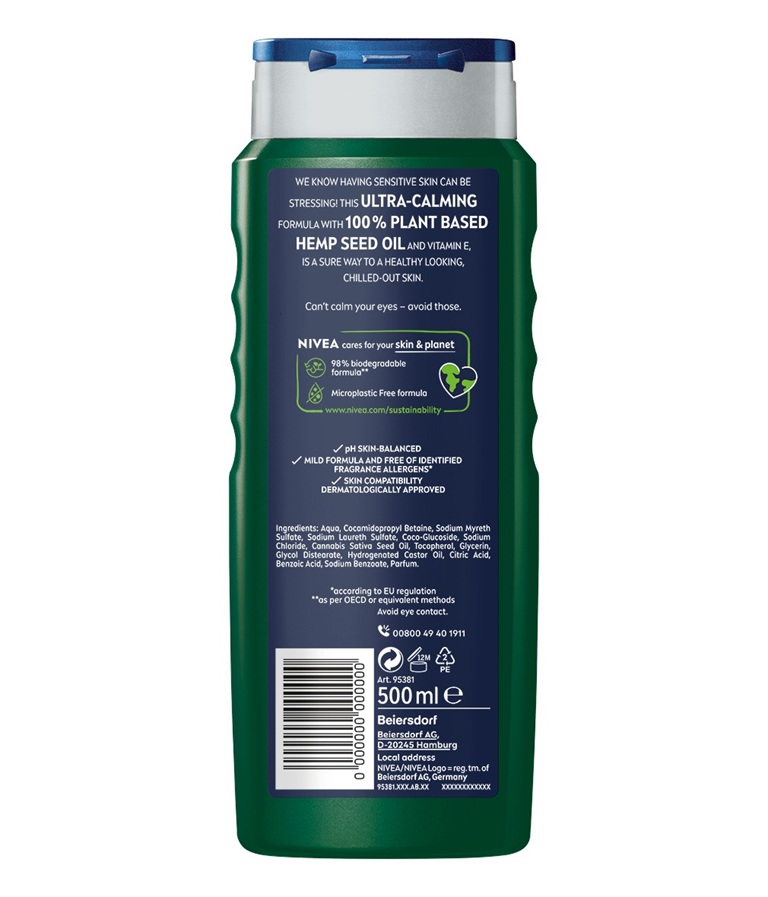 NIVEA MEN SENSITIVE PRO „ULTRA-CALMING“ dušo gelis kūnui, plaukams ir veidui su 100% augalinės kilmės kanapių sėklų aliejumi ir vitaminu E.