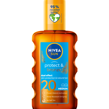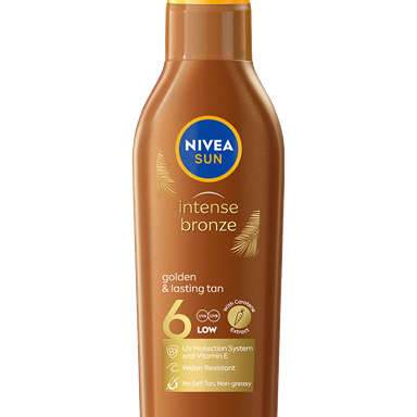 NIVEA SUN Protect & Bronze dvejopo poveikio apsauginis losjonas nuo saulės su promelanino ekstraktu ir SPF50 užtikrina itin veiksmingą ir greitą apsaugą nuo UVA ir UVB spindulių ir natūralus pro-melanino ekstraktas skatina natūralų odos įdegio procesą*.