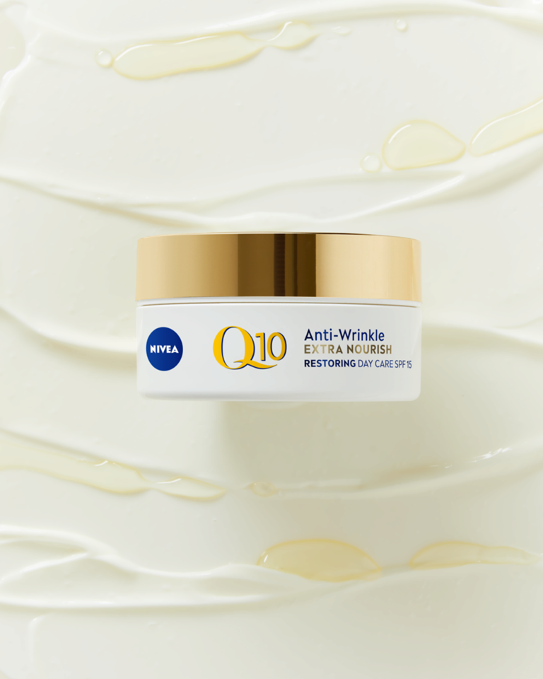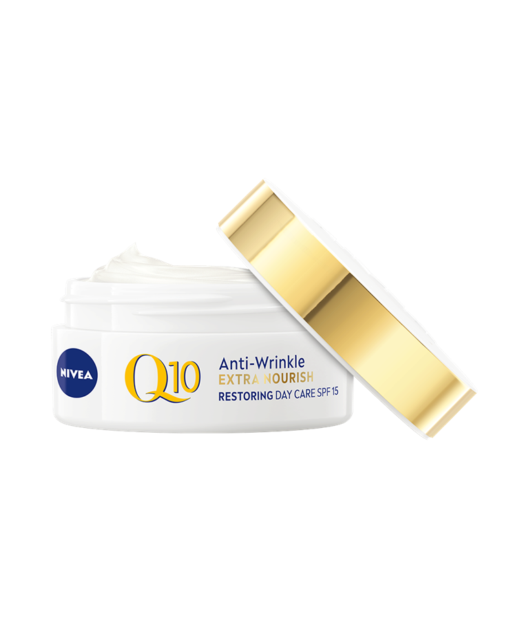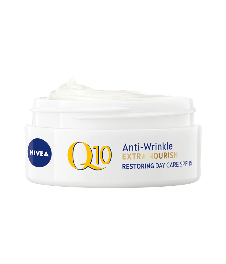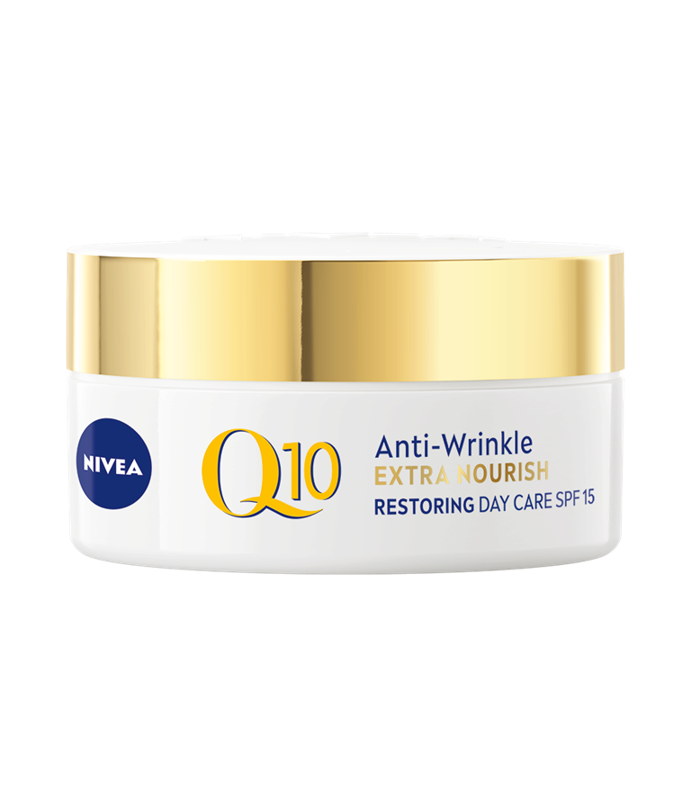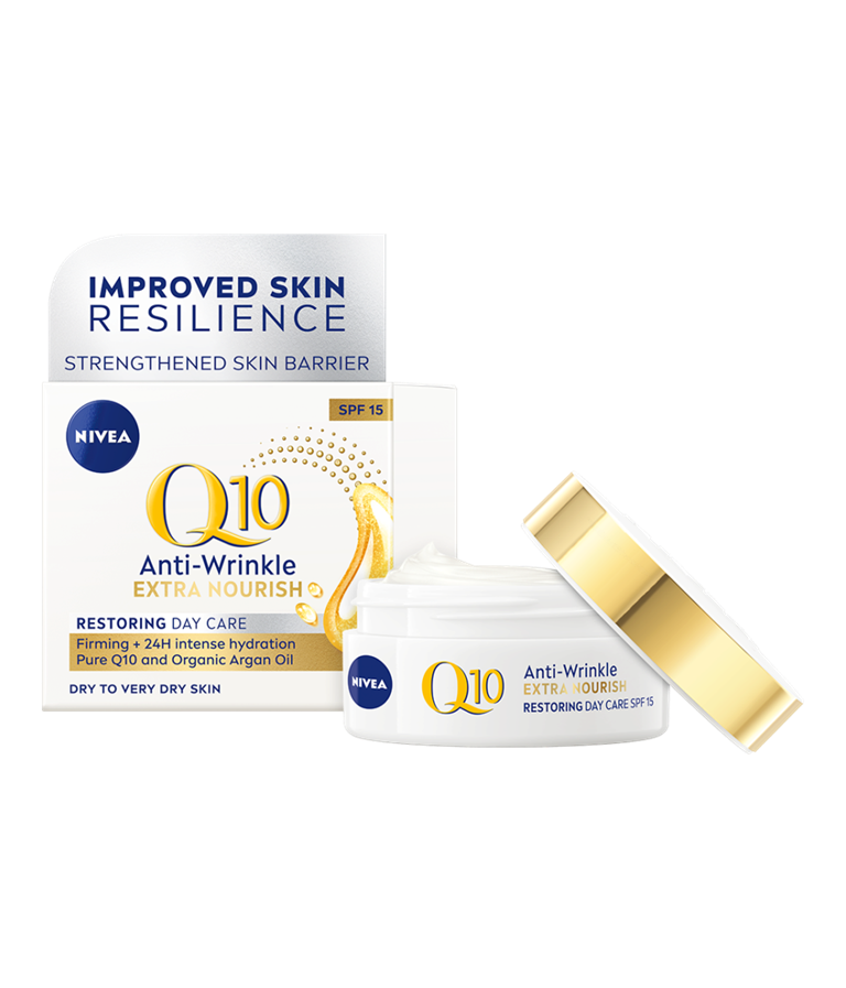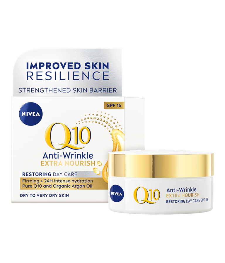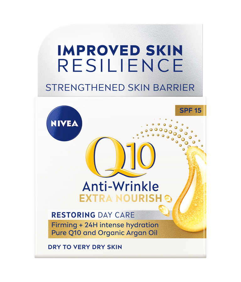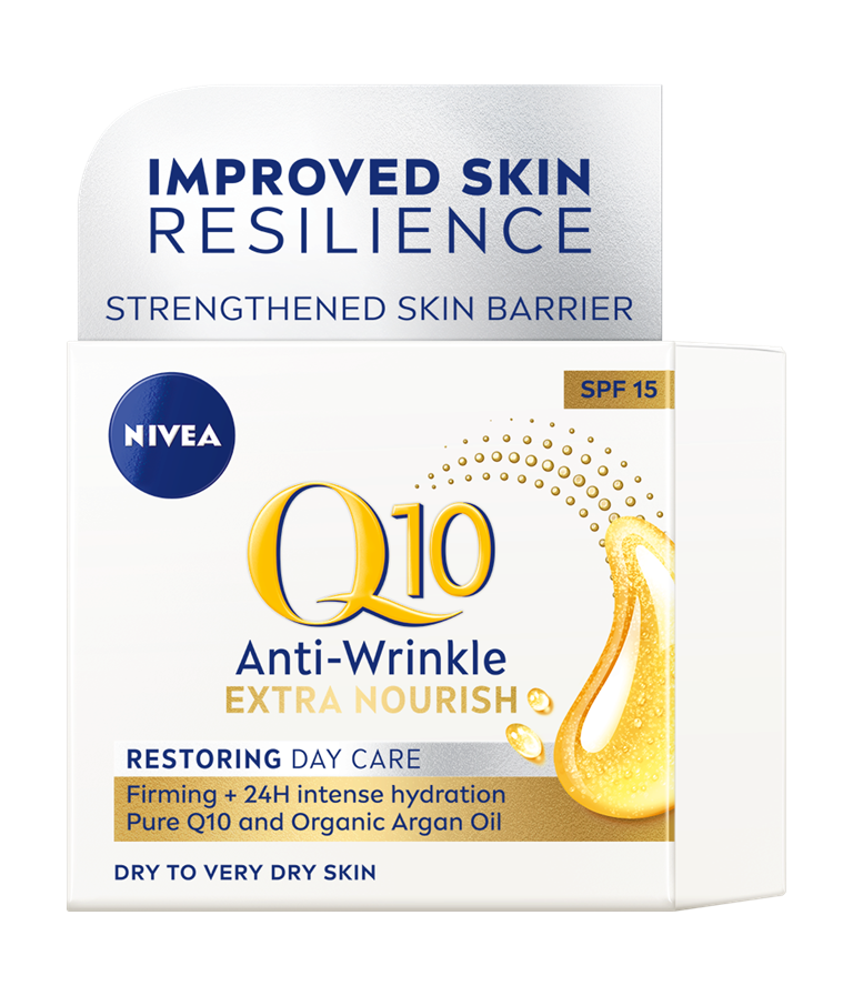 NIVEA Q10 ANTI-WRINKLE EXTRA NOURISH atkuriamasis dieninis kremas nuo raukšlių su dvigubo poveikio grynuoju kofermentu Q10 ir 100% organiniu argano aliejumi sausai ir labai sausai odai.