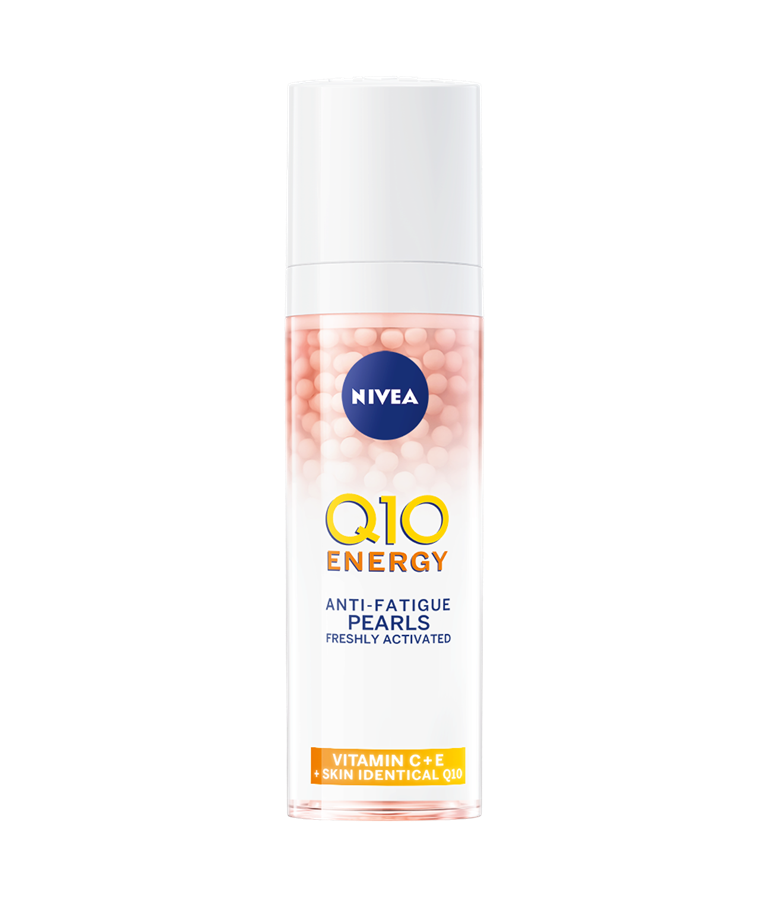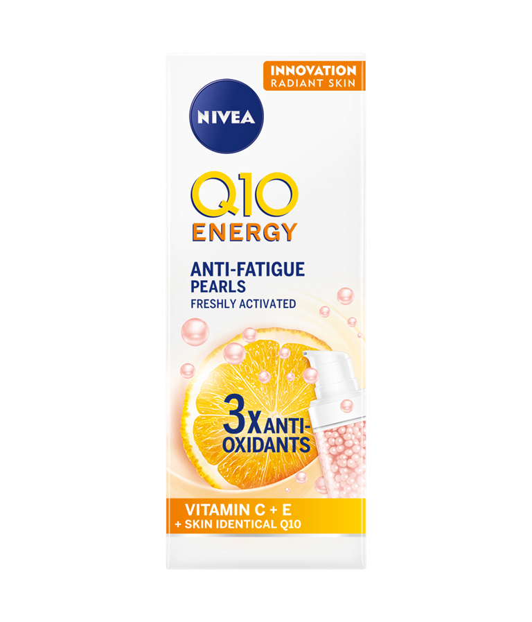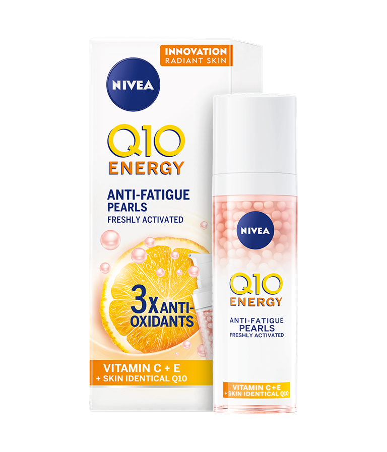 Aqua, Glycerin, Isodecyl Neopentanoate, Methylpropanediol, Tapioca Starch, Propylene Glycol, Ubiquinone, Sodium Ascorbyl Phosphate, Tocopheryl Acetate, Sodium Hyaluronate, Creatine, 1-Methylhydantoin-2-Imide, Polyglyceryl-6 Stearate, Polyglyceryl-6 Behenate, 1,2-Hexanediol, Algin, Chondrus Crispus Powder, Acrylic Acid/VP Crosspolymer, Sodium Citrate, Calcium Chloride, PEG-40 Hydrogenated Castor Oil, Synthetic Fluorphlogopite, Tin Oxide, Sodium Hydroxide, Phenoxyethanol, Linalool, Limonene, Parfum, CI 73360, CI 77891NIVEA Q10 ENERGY SERUMAS SU PERLAIS VIDUJE IR VITAMINU C, VITAMINU E IR 100% ODAI IDENTIŠKU KOFERMENTU Q10. Šis šviežiai aktyvuojamas serumas: 1. Sumažina nuovargio požymius. 2. Pagerina odos tekstūros tolygumą per 24-ias valandas. 3. Oda tampa labiau švytinti ir stangresnė per 2 savaites. Tepkite kiekvieną rytą ir vakarą ant nuvalyto veido, kaklo ir dekoltė zonos prieš dieninį ar naktinį kremą. TINKAMUMAS ODAI PATVIRTINTAS DERMATOLOGIŠKAI.