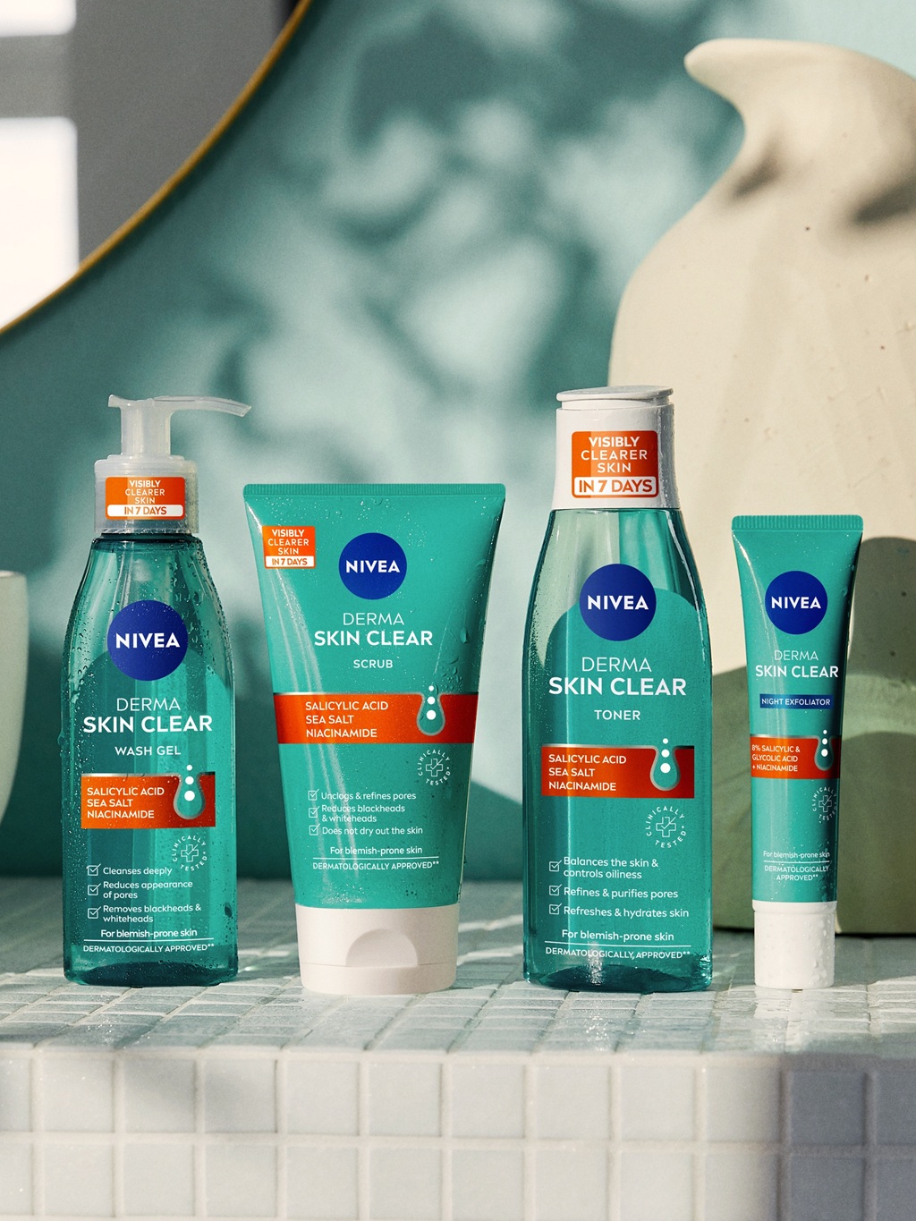 Riebiai ar į spuogus linkusiai odai išbandykite NIVEA Derma Skin Clear liniją. Šios veganiškos formulės priemonėse yra niacinamidas, salicilo rūgštis ir vaisių rūgštys; jos skirtos juodiems taškams, baltiems taškams ir spuogeliams mažinti. Klinikinių tyrimų duomenimis, per septynias dienas oda gali atrodyti vizualiai švaresnė.
