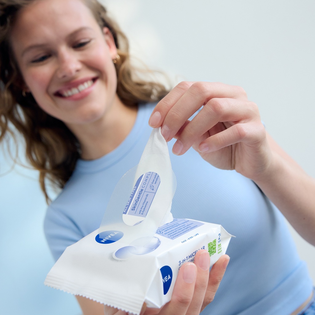 Laikomi odos priežiūros naujove, NIVEA micelinis vanduo ir micelinės servetėlės leidžia valyti, tonizuoti ir drėkinti vienu patogiu žingsniu.